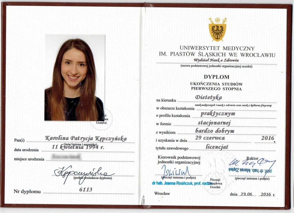 Jestem dietetykiem klinicznym, absolwentką studiów magisterskich Uniwersytetu Medycznego im. Piastów Śląskich we Wrocławiu.